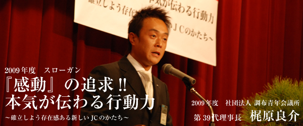 (社)調布青年会議所は、2010年10月に40周年を迎えます。そのためにも、39年目となる2009年度において価値ある積み重ねをしてゆきたい。45周年・50周年の調布JCを見据え、中長期的ビジョンの策定とその時代の調布JCを担う熱きJAYCEEの獲得と育成にも力を注いで参ります。そして、素晴らしい仲間たちと「本気」が伝わる言葉で夢を語り合い、ともに動きまわる年度にしてゆきたい。