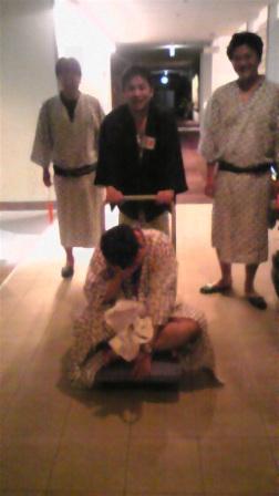 居酒屋道場終了後 近所のカラオケスナックにて 40名ほどで懇親会を開催し その後 委員会メンバー15名ほどで 古今亭(ほうとう屋)さんにて 2次会、反省会を開催し ようやく 深夜2時に ホテル露天風呂入ることができました (2次会にてワインの一気OR一揆 自爆の新ちゃん 一足先に爆睡中です〜)お風呂から上がると ちょうさん・カズさん・山ちゃんが 喉がかわいた〜 ビールが飲みたい〜 お腹が空いた〜 ということで ホテルの目の前の ラーメン屋に入店 がしかし 朝4時に 渋川副委員長より 特別研修の時間なので 至急部屋へ戻るよう指示があり ホテルフロントの方と マスタキーを使い 全部屋全メンバーを起こして 特別研修会場へ移動しました。 がしかし 担当委員会の くみちゃんとしんちゃんが起きてきません。 メンバー勢ぞろいしてるので かなりまずい状況です〜 そーだ こうすれば 移動も楽々だ! ![]() ![]() ビニール袋を片手に新ちゃんでした 4時半 ようやく開場につきました すごく 重たい空気でした ![]() ![]() ![]() 座禅研修30分 じゃっかん 睡魔に負けて 倒れるて寝てしまう方も多数いらっしゃいましたが 無事研修を終えました。 座敷に入れなかった 新ちゃんは 廊下にて特別研修を受講中 (悪い同級生達ですね)のぶちゃん 安全運転で 部屋まで送ってね! ![]() あっ いっけねぇ〜 3部アトラクション景品で 歌手 大槻信也さんより いただいた プレミアム サイン入りの色紙に 名前を記入するのを忘れてました。 朝食と就寝中の片桐先輩〜 ![]() 奥様のお名前で書き込んでおきました ![]() これで ようやく 私も床につかせていただきます。 10時 チャックアウトの頃には 新ちゃんさんも 少し落ち着き ![]() 台車も本来の目的通り使用できました ![]() 究極のダイエットに挑戦した 新ちゃんも 笑って バイバイできました。 これで すべてのプログラム終了です。 お疲れ様でした。 投稿者:委員長 |